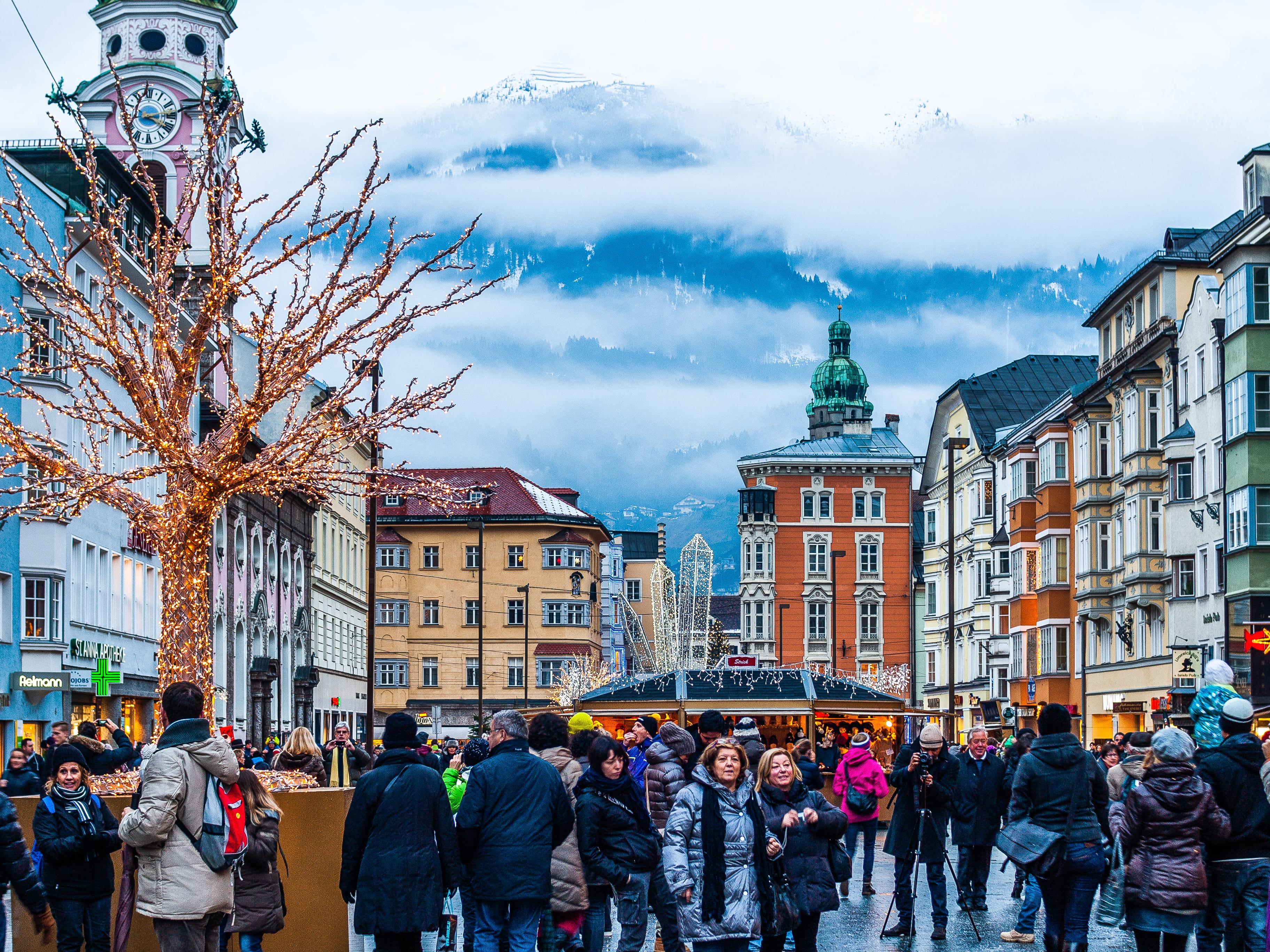 Inmitten der verschneiten österreichischen Alpen finden in Innsbruck gleich mehrere zauberhafte Weihnachtsmärkte statt. In der mittelalterlichen Altstadt glitzert ein riesiger Baum vor dem Goldenen Dachl. Volksmusikkapellen spielen auf und in stimmungsvoll geschmückten Holzhütten werden regionales Kunsthandwerk, Kerzen, Lebkuchen und Glühwein angeboten. Kinder lieben die traditionellen Fahrgeschäfte und Puppenspiele auf dem Marktplatz am Flussufer oder einen Spaziergang durch die märchenhafte Kiebachgasse. Die Maria-Theresien-Straße wird von Marktständen und Bäumen mit funkelnden Lichtern erhellt.