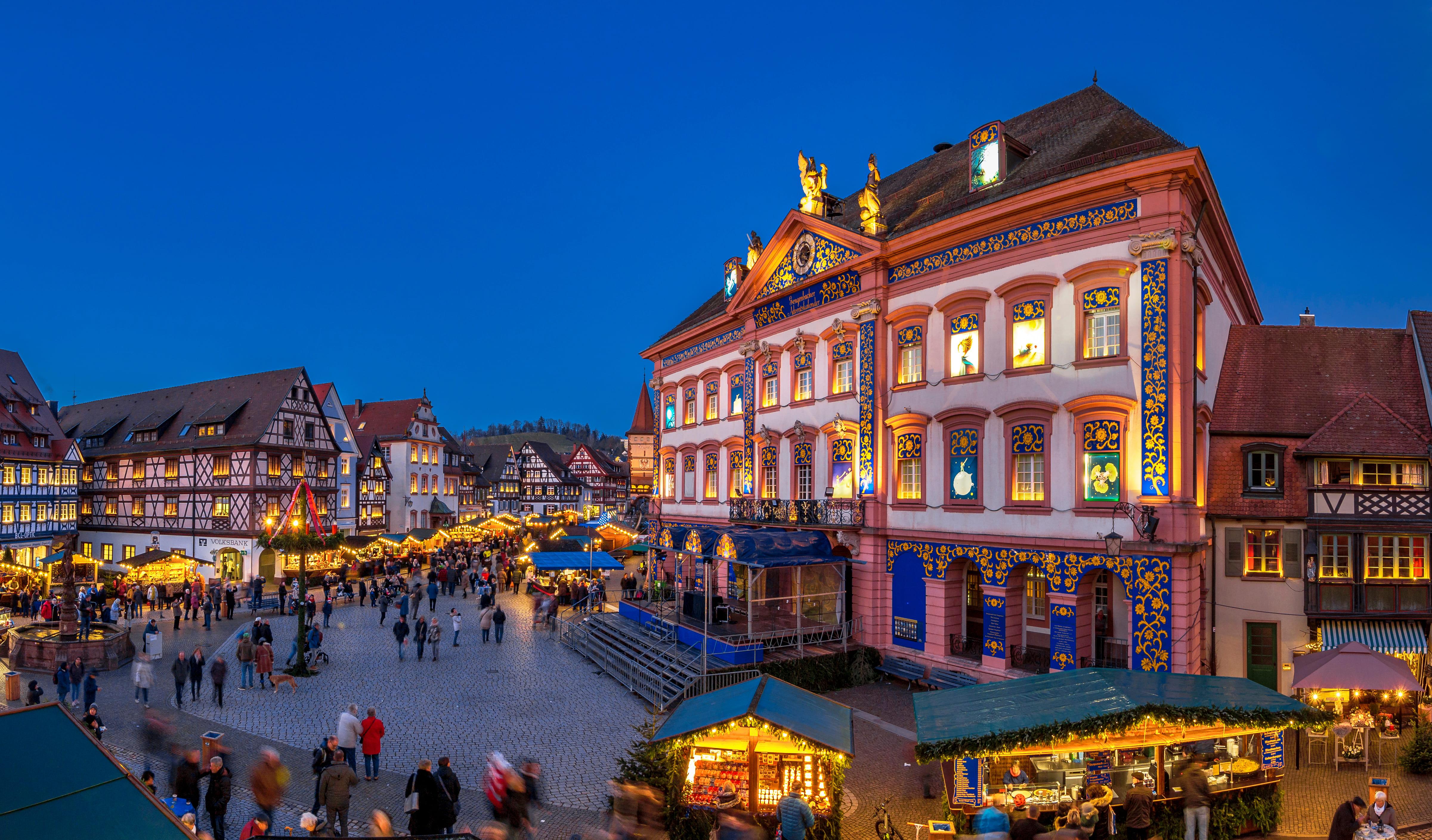 Traditionelle Weihnachtsmärkte gibt es in Deutschland viele, aber kaum eine Stadt ist so zauberhaft weihnachtlich wie Gengenbach im Schwarzwald. Die Altstadt mit ihren Fachwerkhäusern gleicht einer märchenhaften Schneekugel, wenn die Lichterketten angezündet werden, die Holzhütten leuchten und die Sternsinger vor dem rosa-cremefarbenen Rathaus aus dem 18. Jahrhundert singen. Jeweils um 18 Uhr kannst du dir hier einen Platz sichern, wenn eines von 24 Fenstern geöffnet wird, um eine Adventskalenderszene von bekannten Künstlern und Illustratoren zu zeigen.
